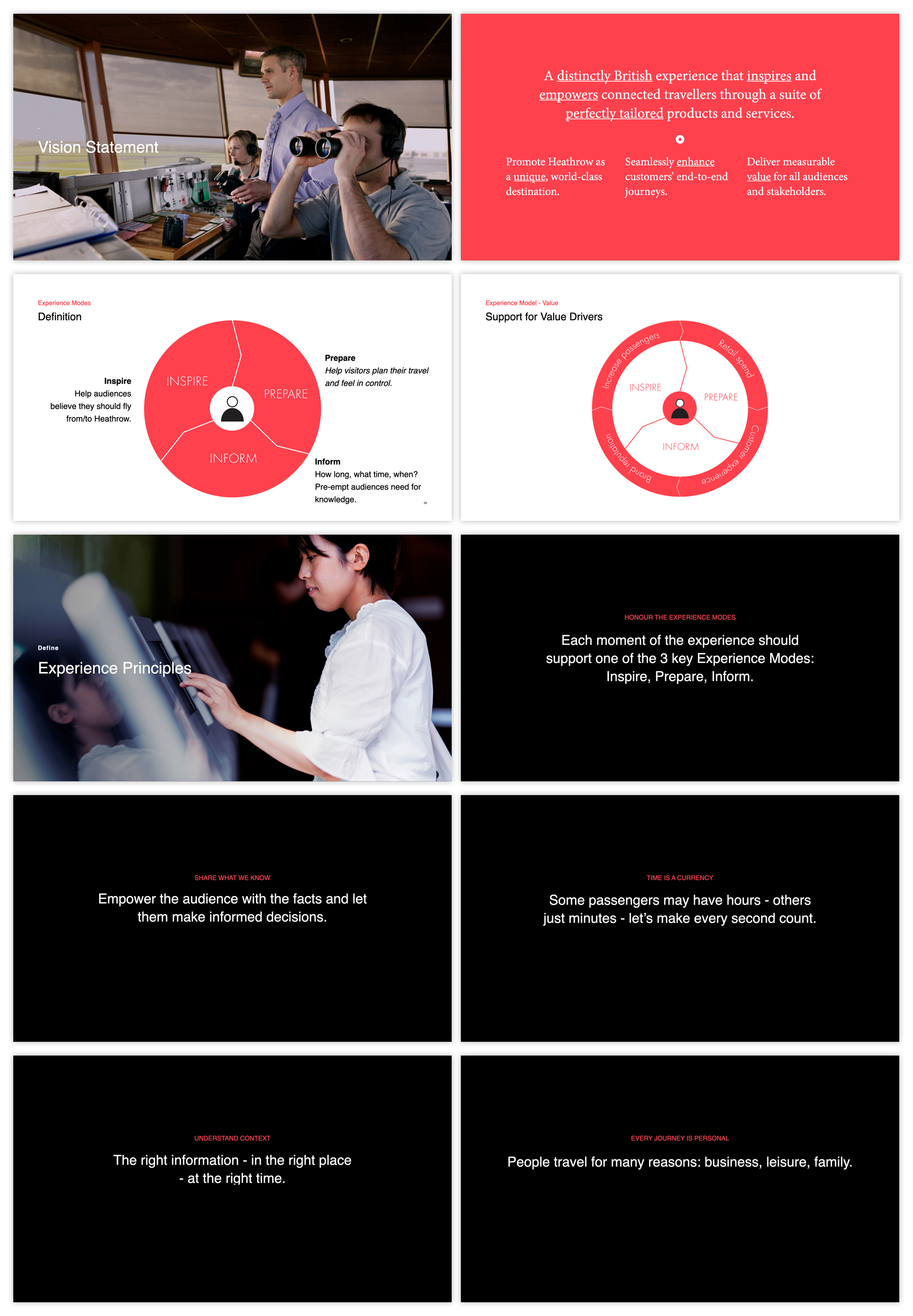 The slides below show edited highlights of the vision statement I created for Heathrow Airport. The ideas generated here were built on a solid foundation of research that included senior stakeholder interviews, customer and audience interviews and a detailed competitor and landscape review. The vision had to be unique whilst connecting with Heathrow's existing marketing strategies and business goals.